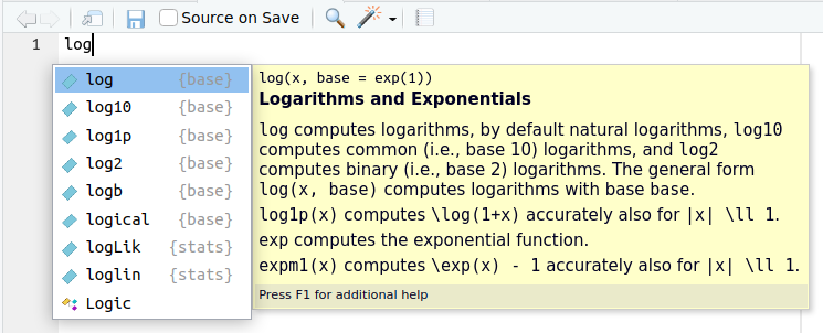 Dieses Ergebnis bedeutet, dass log() zwei mögliche Argumente hat: x und base. Darüber hinaus besagt base = exp(1), dass es für das zweite Argument eine Voreinstellung gibt, nämlich die Zahl exp(1), also die Euler’sche Zahl $e$. Diese Zahl wird dabei als Ergebnis der Funktion exp() gewonnen:
