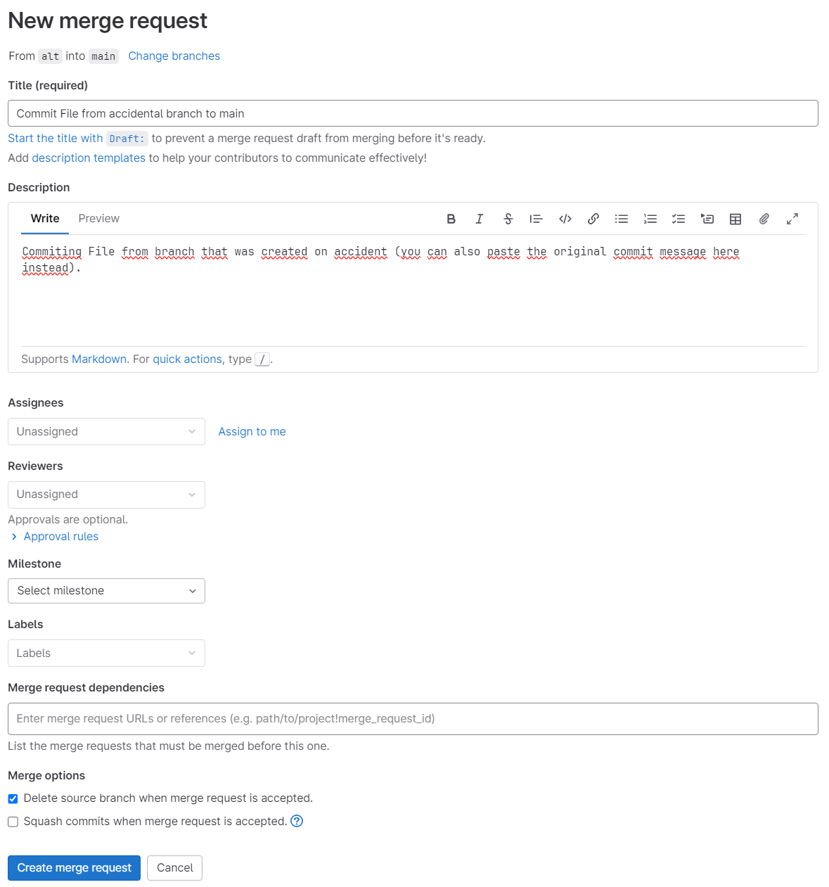 Wählt danach, sofern ihr den anderen Branch löschen wollt da ihr ihn unabsichtlich erstellt habt, Delete source branch when merge request is accepted aus. Danach könnt ihr Create merge request anklicken.