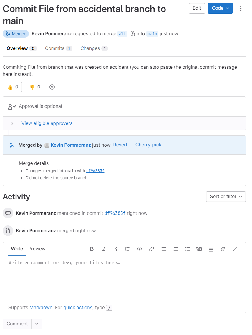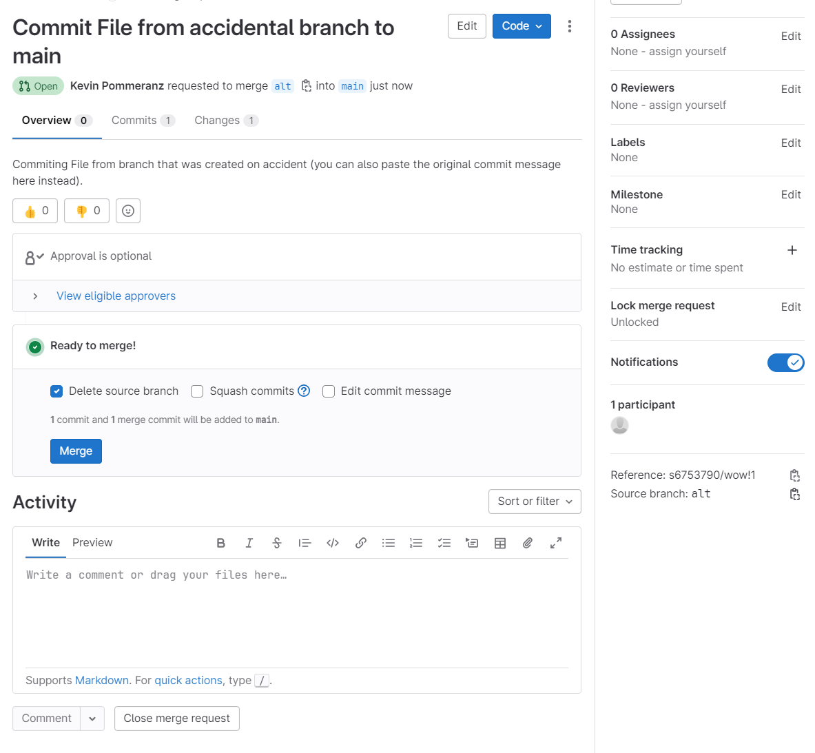 Hier solltet ihr eure Änderungen auf dem anderen Branch als Merge Request sehen.