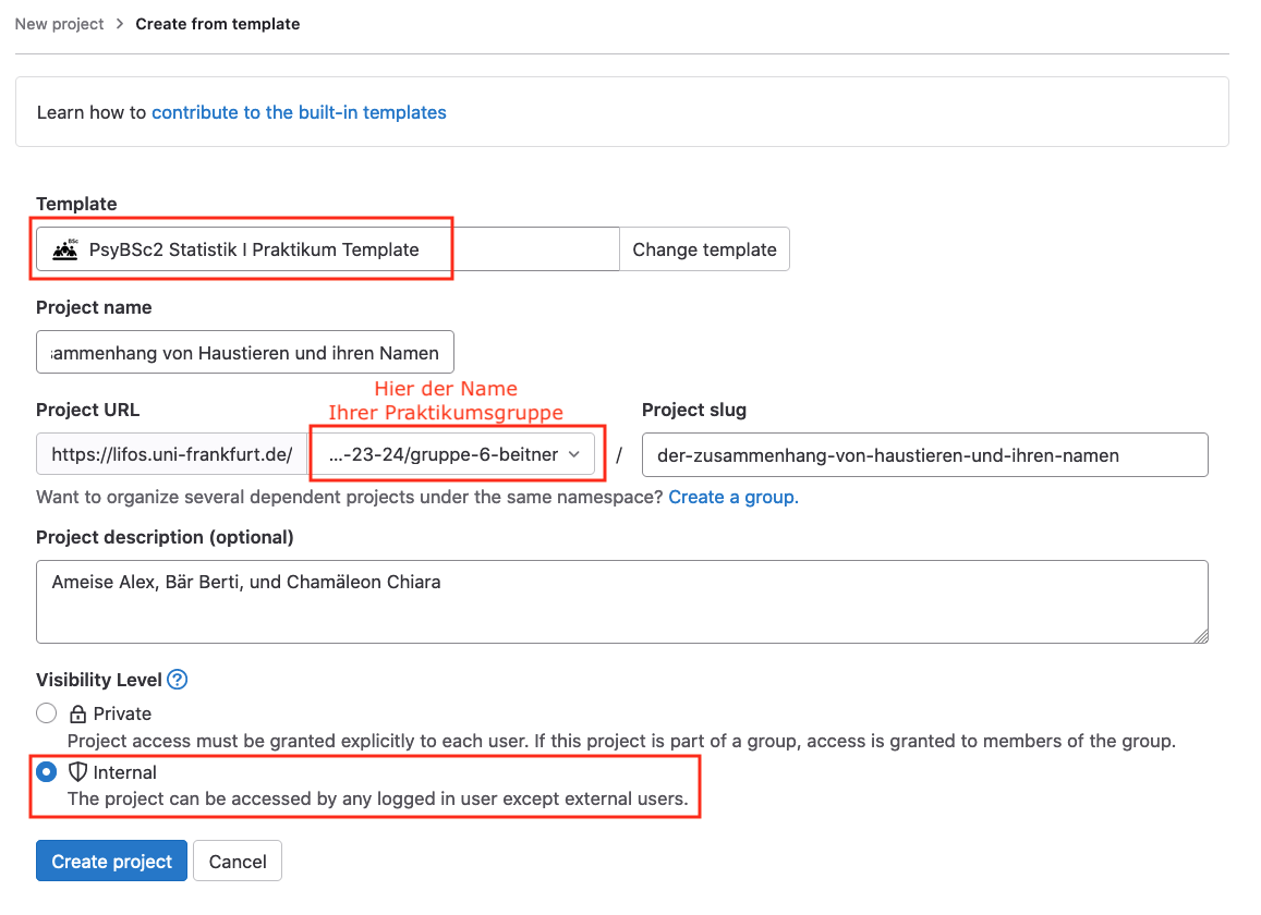 Nachdem Sie und Ihre Gruppenkolleg:innen Mitglied in Ihrer Praktikumsgruppe wurden, können Sie Ihr Projekt in der Gruppe anlegen. Hierfür ist es wichtig, dass Sie bereits Ihre Fragestellung kennen, um einen inhaltlichen Titel für Ihr Projekt angeben zu können. Begeben Sie sich auf LIFOS zu Ihrer Praktikumsgruppe. Wichtig: Es reicht aus, wenn eine Person aus Ihrer Gruppe das Projekt anlegt. Sie können im Anschluss alle darauf zugreifen. Klicken Sie auf den blauen Knopf New Project, dann auf Create from template, dann auf Instance, und dann bei PsyBSc2 Statistik I Praktikum Template auf Use template. Hier können Sie nun Ihren Projekttitel eingeben und in der Project description geben Sie alle Namen Ihrer Projektgruppe, den Kurs, und das aktuelle Semester an und zwar im Stil: Eure Namen – Kurs – Semester. Zum Beispiel: Ameise Alex, Bär Berti, Chamäleon Chiara - Statistik I Praktikum - WiSe 2023/24. Dadurch können andere später leichter nachvollziehen, wer an dem Projekt mitgearbeitet hat. Obwohl die folgenden Dinge bereits richtig eingestellt sein sollten, achten Sie vor der Erstellung noch darauf,