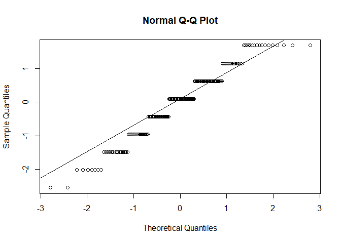 Eine zweite Möglichkeit ist das Erstellen eines sogenannten QQ-Plots (steht für quantile-quantile). Auf der x-Achse sind diejenige Positionen notiert, die unter Gültigkeit der theoretischen Form der Normalverteilung zu erwarten wären. Auf der y-Achse wird die beobachtete Position eines Messwerts abgetragen. Damit die Werte die gleiche Skalierung haben und damit einfacher interpretierbar sind, standardisieren wir zunächst unsere Variable neuro