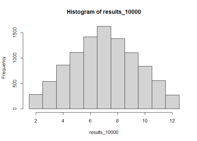 Wie aus der Vorlesung und der eigenen Brettspielerfahrung bekannt, ist der Erwartungswert für ein einzelnes Ereignis nicht aussagekräftig - man würfelt nicht mit jedem Wurf 7. Doch gibt es eine Beziehung zwischen beobachteter und erwarteter Häufigkeit, die man durch häufiges Wiederholen abbilden kann. Dafür könnte man 1000 Mal per Hand die Würfel werfen und das Ergebnis jeweils in R