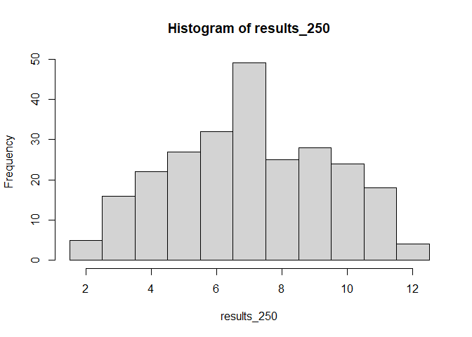 results_250 <- sample(x = wuerfel, size = 2, replace = TRUE) |> sum() |> replicate(n = 250)