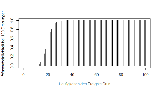 Neben der genauen Erfolgszahl gibt es auch häufig Fragestellungen, die sich mit Bereichen befassen: Wie wahrscheinlich ist es, dass höchstens 20 Mal grün gedreht wird bei 100 Versuchen? In unserem Plot der Wahrscheinlichkeitsverteilung würde der erfragte Wert die Summe der Werte vieler Balken sein.