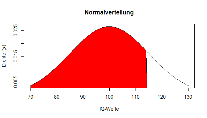 Für die IQ-Verteilung der Population wird angenommen, dass diese den Mittelwert von 100 hat und eine Standardabweichung von 15. Die bewährten Tests werden dahingehend genormt. Wenn wir nun den Wert auf der x-Achse aus der Dichtefunktion eines Probanden erfahren wollen (IQ = 114.3), können wir diesen mit der dnorm()