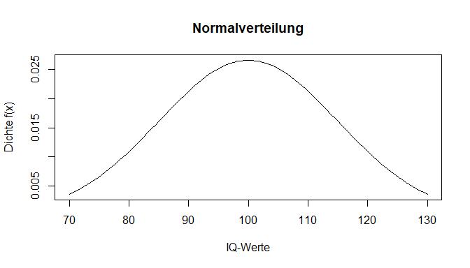 Hierbei ist es wichtig zu wissen, dass die Wahrscheinlichkeitsdichte nicht als Wahrscheinlichkeit für das Ergebnis eines individuellen Wertes verstanden werden darf. Da es bei stetigen Zufallsvariablen überabzählbar unendlich viele Ergebnisse gibt, ist die Wahrscheinlichkeit für einen fixen Wert x gleich 0. Demnach ist der Wert aus der Dichtefunktion alleine noch nicht aussgekräftig für die Anwendung. Trotzdem betrachten wir zunächst den grafischen Aspekt. Wenn wir nun den eben gesehenen Plot zeichnen wollen, verwenden wir bei stetigen Funktionen, wie es die Dichtefunktion eine ist, den Befehl curve(). Dafür muss im Argument expr eine Funktion in Abhängigkeit von x genannt werden. Mit from und to legt man die Grenzen der Bereiche fest. Auf der x-Achse (xlab) sollen die möglichen IQ-Werte, auf der y-Achse (ylab) die zugehörigen Werte der Dichtefunktion f(x) abgebildet werden. Mit main wird ein Titel für die Grafik vergeben.