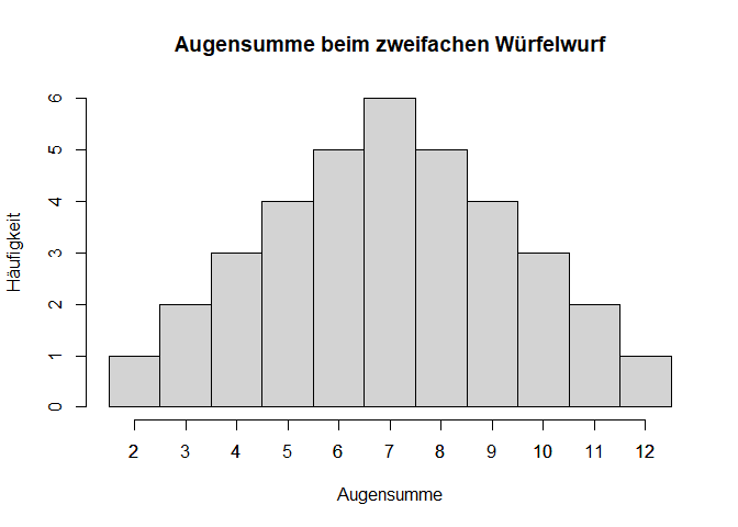 Zur Veranschaulichung der Ergebnisse können Sie das bereits besprochene Histogramm nutzen, das Häufigkeiten abbildet. Mit xlim legen wir in diesem Fall die Grenzen der möglichen Ereignisse fest, auch wenn diese noch nicht aufgetreten sind. breaks sind die Übergänge zwischen den Balken. Um die Balken jeweils über der ganzen Zahl (also den möglichen Ereignissen von 2 bis 12) zu haben, setzen wir die Punkte auf 1.5, 2.5, 3.5 und so weiter bis 12.5. Dies wird durch den Doppelpunkt erreicht, der so oft auf den Wert der unteren Grenze eins addiert, bis er bei der oberen angekommen ist.