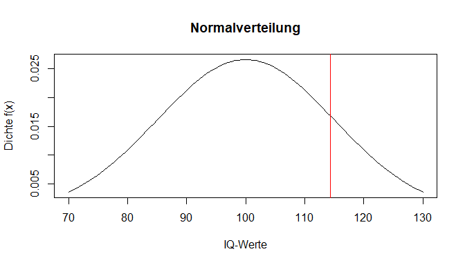 Für die IQ-Verteilung der Population wird angenommen, dass diese den Mittelwert von 100 hat und eine Standardabweichung von 15. Die bewährten Tests werden dahingehend genormt. Wenn wir nun den Wert auf der x-Achse aus der Dichtefunktion eines Probanden erfahren wollen (IQ = 114.3), können wir diesen mit der dnorm() Funktion berechnen. Benötigt werden neben dem x-Wert (in diesem Fall der IQ-Wert) noch der Mittelwert mean und die Standardabweichung sd der zugrundeliegenden Verteilung.