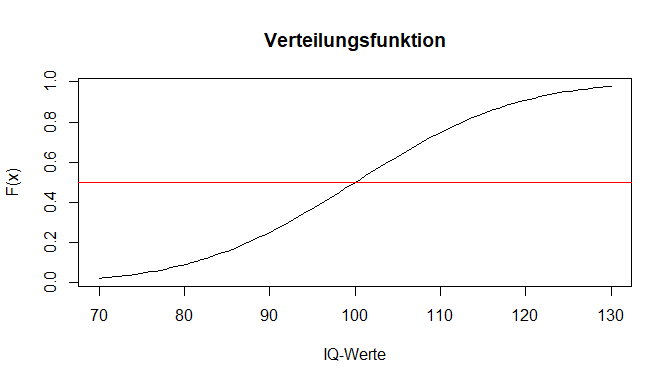 Hier ist schön zu sehen, dass sich die Verteilungsfunktion mit steigendem IQ-Wert der 1 annähert, da dies die Fläche unter der Dichtefunktion ist. Aus der Verteilung haben wir mit pnorm()