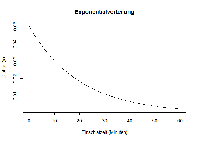 - Zeichnen Sie die Dichtefunktion der Exponentialverteilung für die Einschlafzeit von 0 bis 60 Minuten.