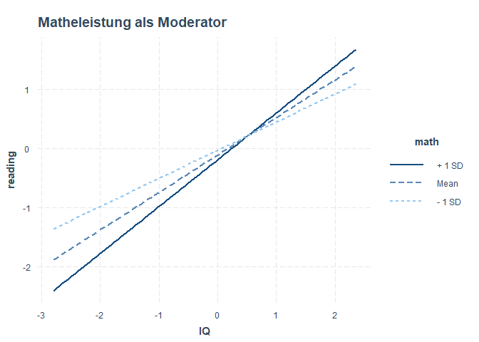 Indem wir eine andere Wirkungsrichtung impliziert haben, verschiebt sich auch die Interpretation unserer Ergebnisse. So könnte aus dieser Darstellung abgeleitet werden, mit einem überdurchschnittlichen IQ der Zusammenhang zwischen der Matheleistung und der Lesefähigkeit positiv ausgeprägt ist, während bei Personen mit unterdurchschnittlichem IQ eine bessere Matheleistung mit einer schlechteren Lesefähigkeit einhergeht.