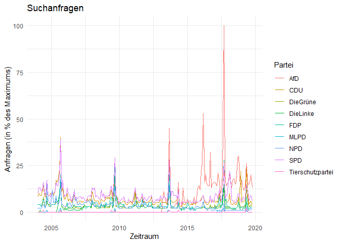 Dieses Projekt befasst sich mit folgender Frage: “Welche politischen Parteien stehen im Zentrum des öffentlichen Interesses?”. Dazu wollen wir uns anschauen, wie sich die Anzahl von Google-Suchanfragen bezogen auf 9 deutsche Parteien seit 2004 entwickelt hat und diese Entwicklung in einer Grafik darstellen. Hat sich das Interesse an den Grünen in Folge der Nuklearkatastrophe in Fukushima im Jahr 2011 gesteigert? Sinkt das Such-Interesse an der SPD parallel zu ihren Umfragwerten in den letzten Jahren? Wie groß ist das Interesse an einer Spartenpartei wie der Tierschutzpartei im Netz? Das sind Fragen, die wir mithilfe der auf Google Trends öffentlich zugänglich gemachten Daten über Suchanfragen in Deutschland untersuchen können.